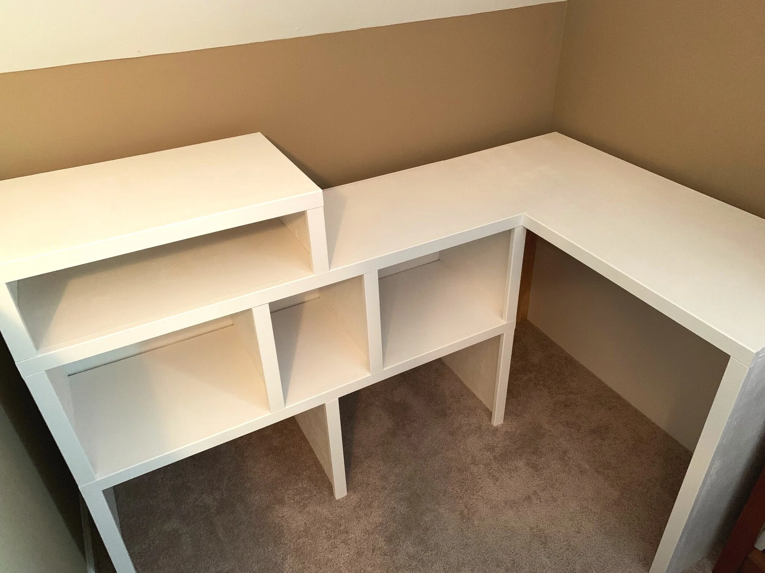 I made the desk the exact same height, backing with plywood again, but this time leaving a gap at both the top and bottom for cords. After painting and putting both pieces in the office, I joined them in place with screws.