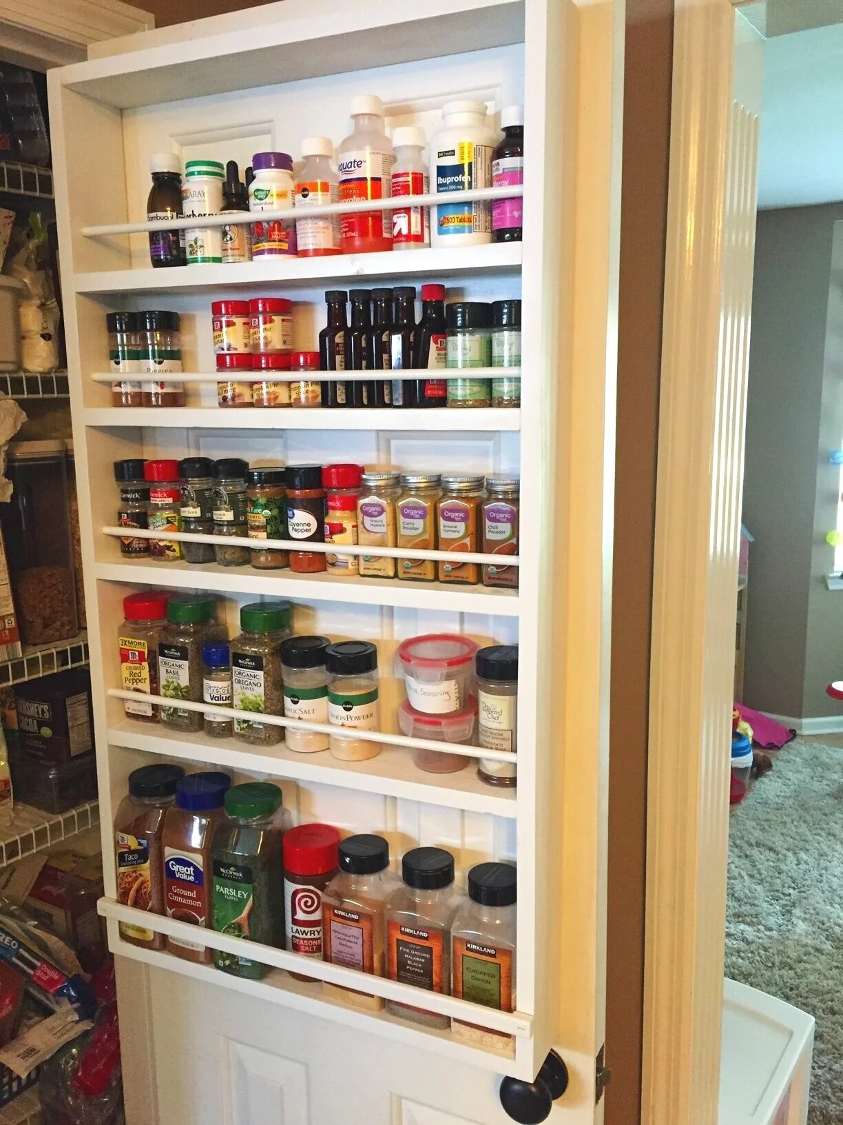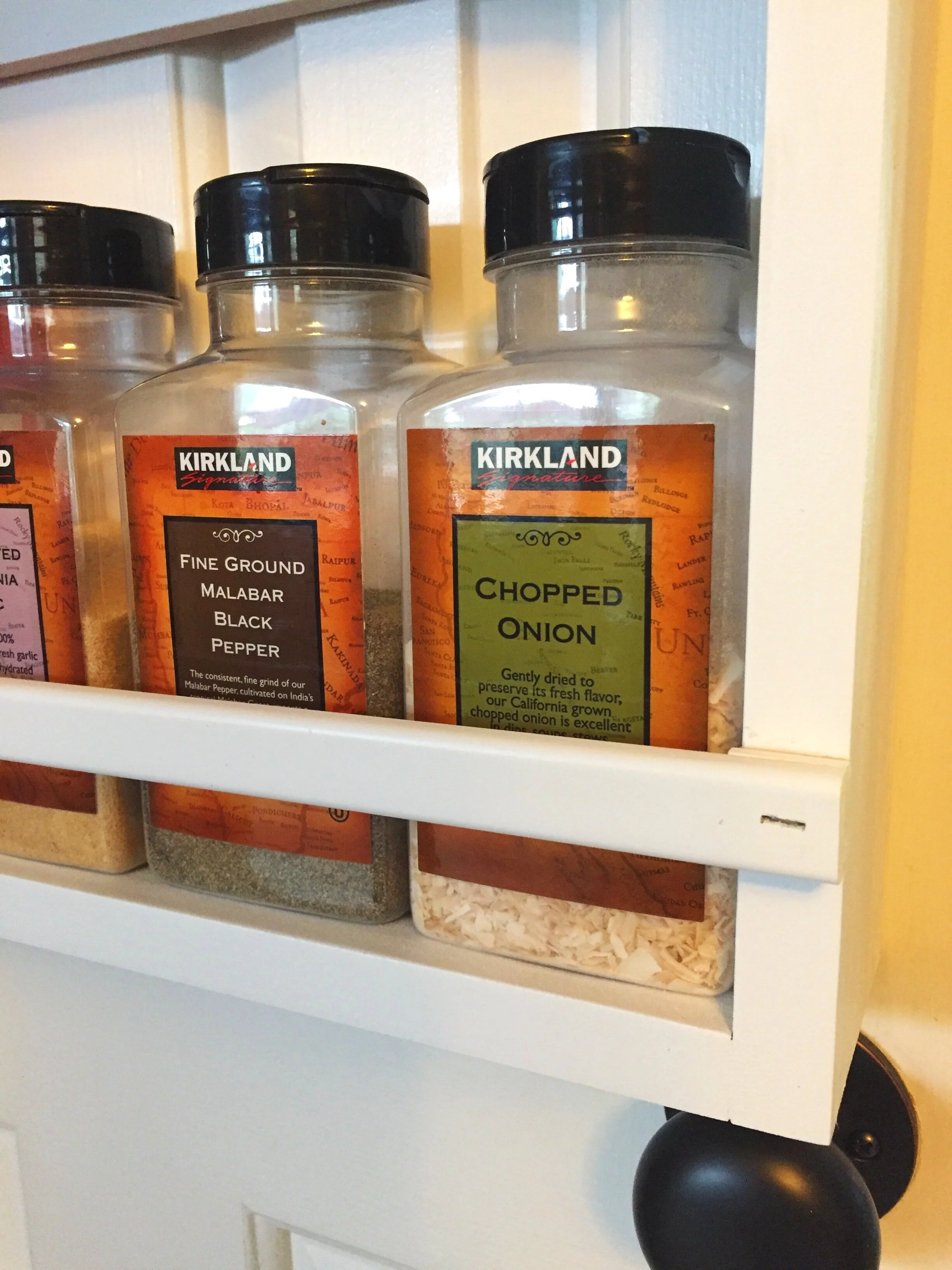 I collected all our herbs and spices to customize my shelf heights. I attached a back on only certain sections in order to mount it to the door. To create a more sleek, built-in look, I also drilled holes only on one side for the dowels. I also inserted spacers and a flexible trim piece for the wider containers on the bottom shelf.