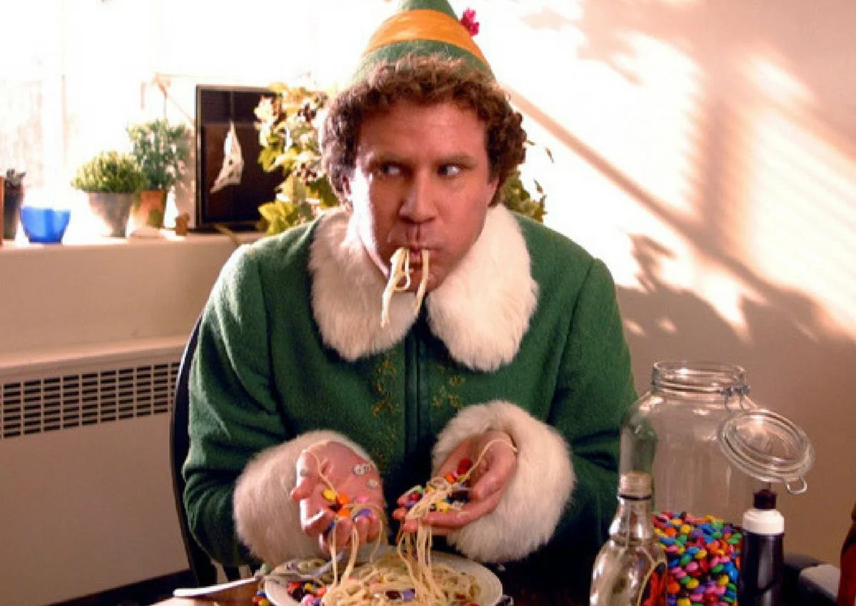 Nope! He was making something else. And doing it too slowly, apparently! Your score: 2/7 Question 8: What does Buddy use to help try to put the star on the Christmas tree? A. a trampolineB. a couchC. a ladderD. a stool